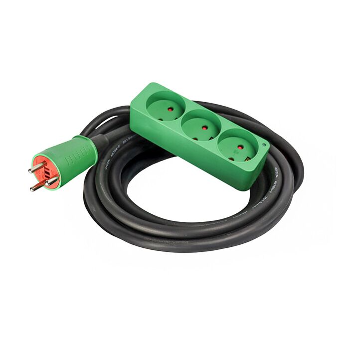 Kabelsættet har en slagfast, jordet DK-stikprop og en 3-stikdåse med jord, hvilket gør det muligt at tilslutte flere elværktøjer samtidig. Den integrerede LED-diode i stikdåsen viser tydeligt, om der er spænding på kablet, så du hurtigt kan kontrollere strømtilførslen på arbejdsstedet.