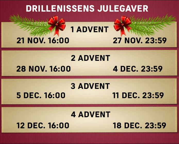 Når du finder og klikker på de 3 drillenisser på vores webshop, deltager du automatisk i lodtrækningen om adventspræmien i den uge, du tilmelder dig.