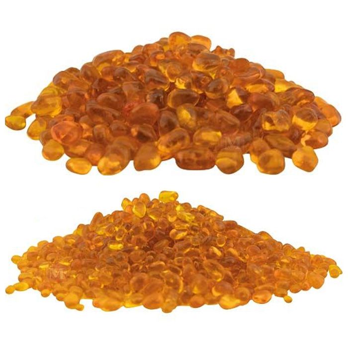 Disse glassten i gylden rav farve er blevet slebet efter at være blevet knust. Dette betyder at de ikke længere har skarpe kanter og forskellige størrelser samt forme. Igennem slibeprocessen er de blevet mere ensformige, hvilket gør dem langt mere brugbare til dekorationer eller epoxy belægning. Du kan stadig se den klare gyldne farve, der kan minde om den gyldne farve ved rav. Ved en bunke af glasperler, vil du opleve at alle perler stadigvæk har en unik nuance af den gyldne rav farve. Nogle er mere rødlige, andre mere gullige. Dog har de alle en gennemgående nuance af varm orange. Ved at have flere perler i en bunke vil du opleve den transparente effekt, hvor midten af bunken vil fremstå mere dyb og mørk i farven.